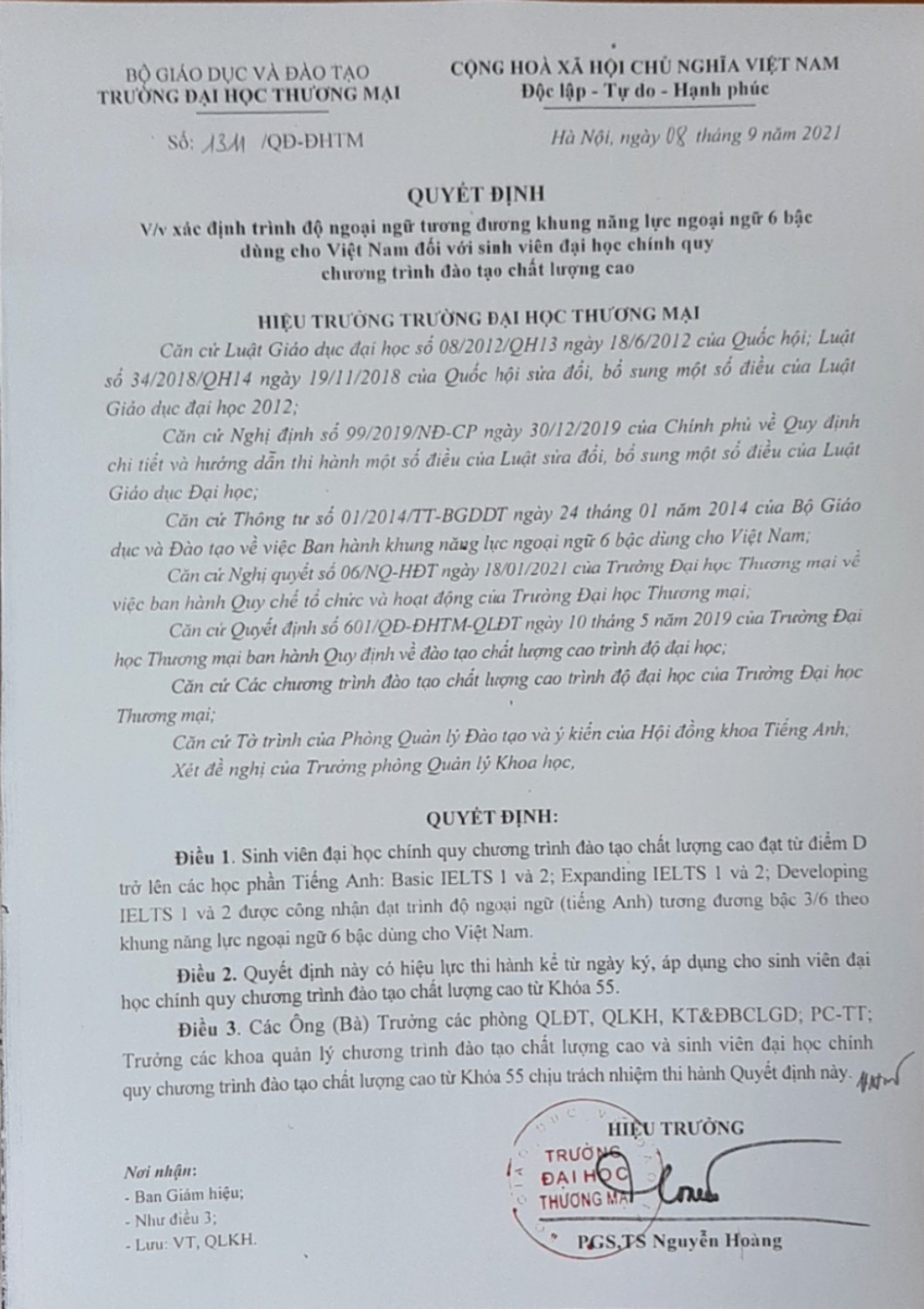 Nhà trường đã ban hành Quyết định số 1311/QĐ-ĐHTM ngày 8/9/2021 về việc xác định trình độ ngoại ngữ tương đương khung năng lực ngoại ngữ 6 bậc dùng cho Việt Nam đối với sinh viên đại học chính quy chương trình đào tạo chất lượng cao.