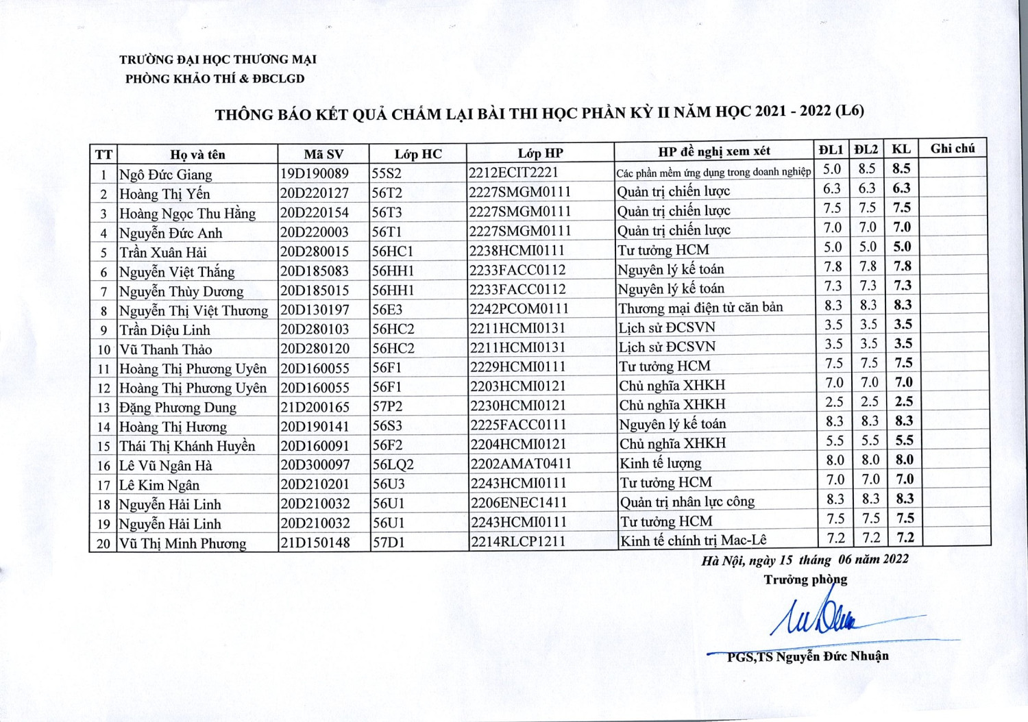 Thông báo kết quả chấm lại bài thi học phần kỳ II năm 2021 -2022 ( Lần 6)