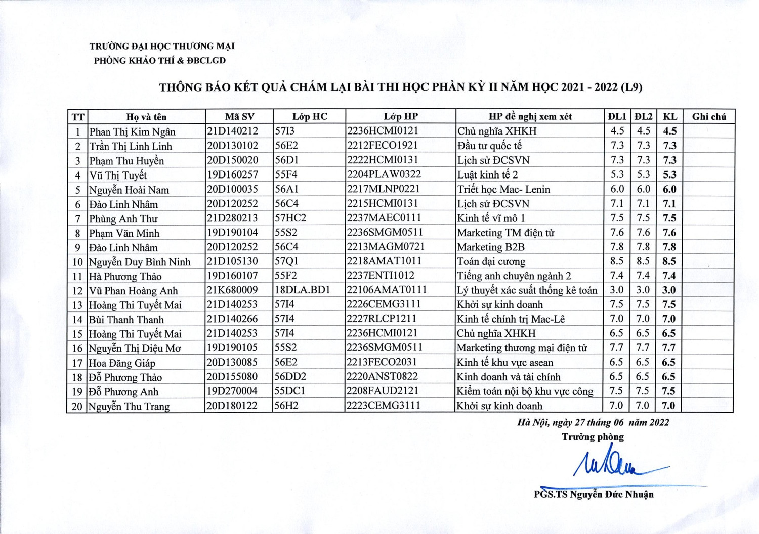 Thông báo kết quả chấm lại bài thi học phần kỳ II năm học 2021-2022 (L9 )